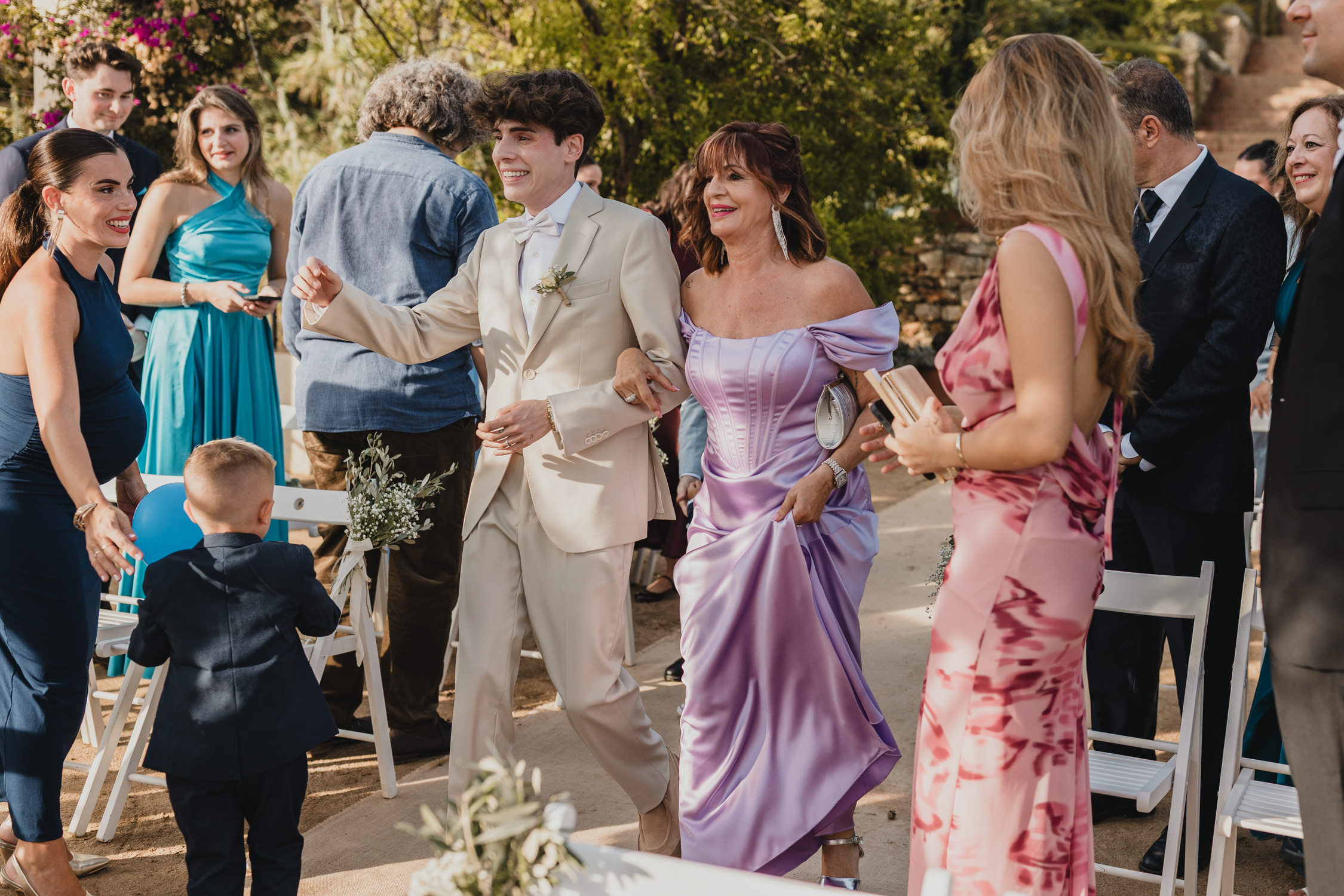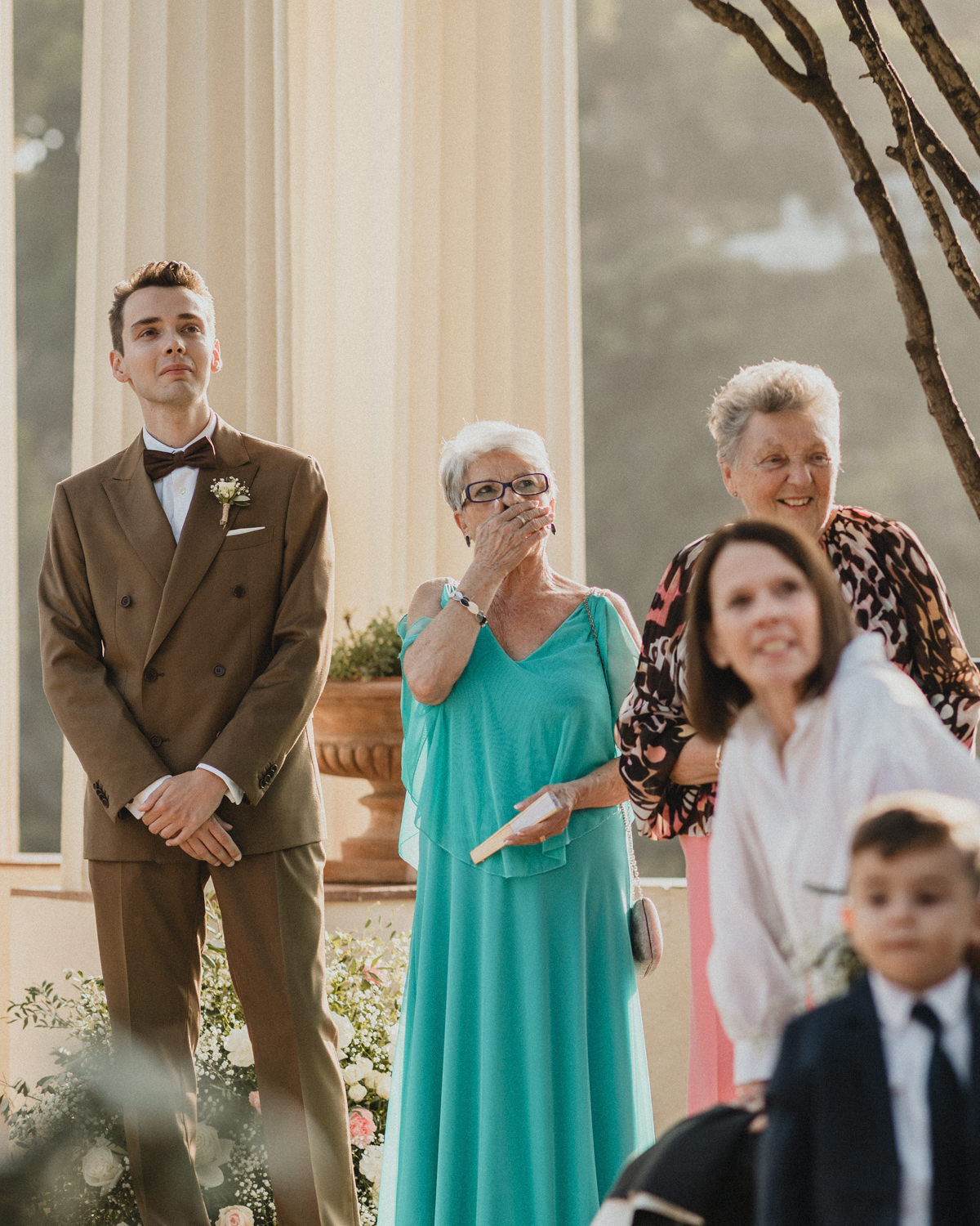 The ceremony area closed exclusively at 3:30pm. Guests arrived by car from 5pm. As they gathered, the entrances unfolded in sequence down the long staircase toward the Templet: bridesmaids, Thibaut with his parents, more bridesmaids, then Adrià with his parents.